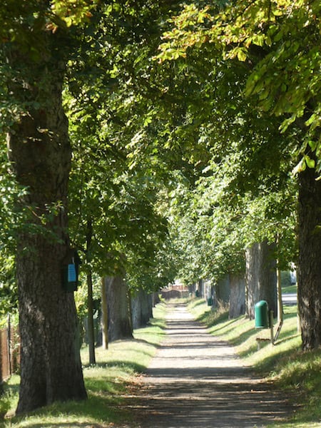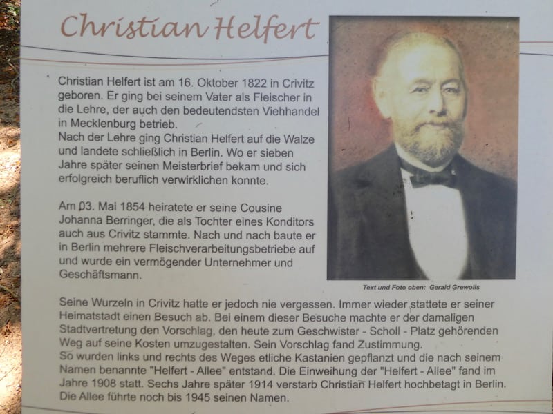 Renate entdeckt währenddessen eine Gedenktafel an Christian Helfert, der seiner Heimatstadt diese wunderschöne Kastanienallee finanzierte.