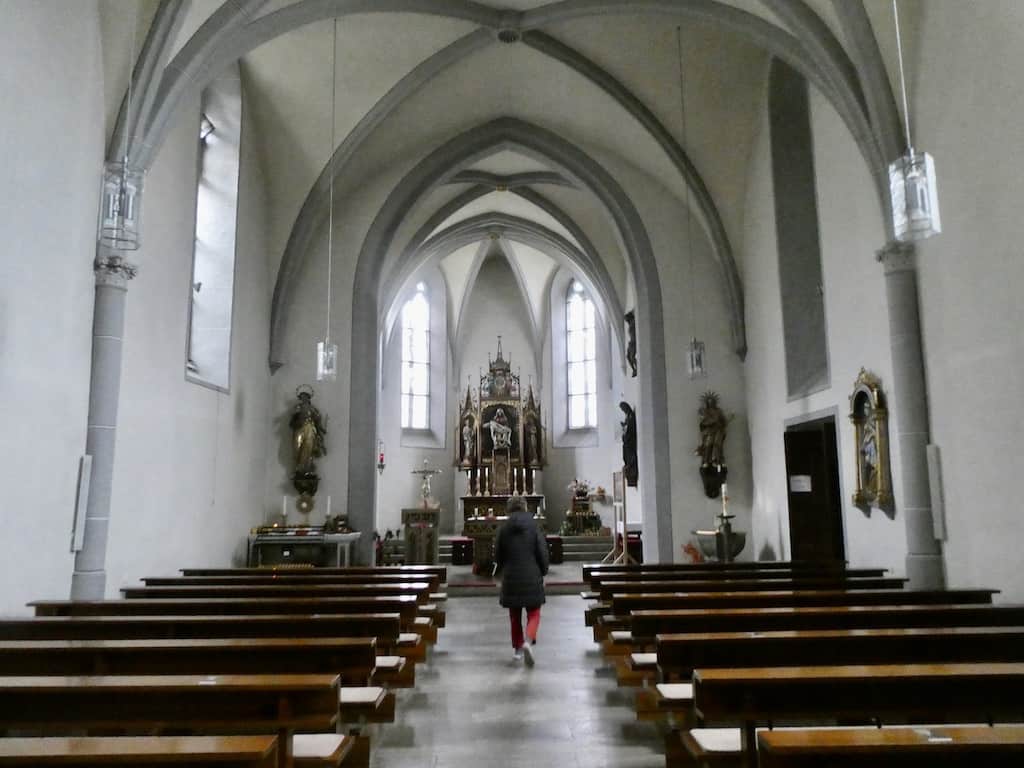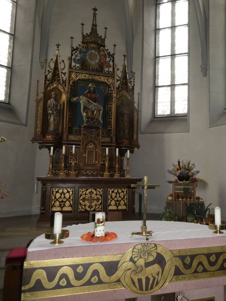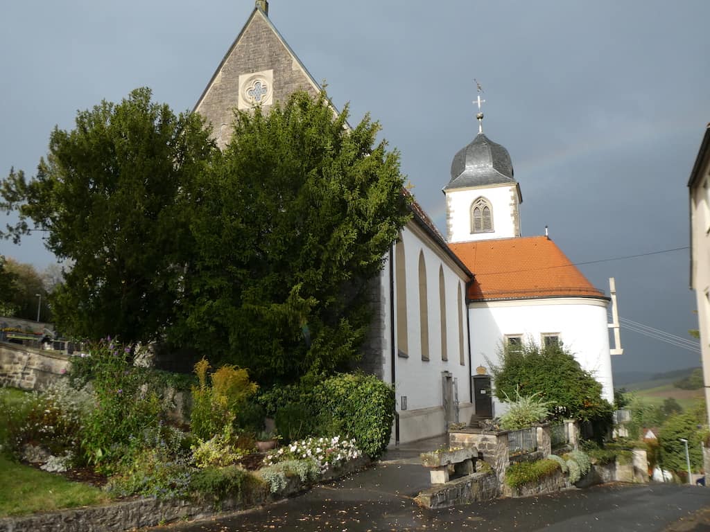In Stuppach lockt uns ein Hinweis zur Grünenwalds Madonna. Genau im Richtigen Augenblick erhellen wieder einige Sonnenstrahlen das Kirchlein.
