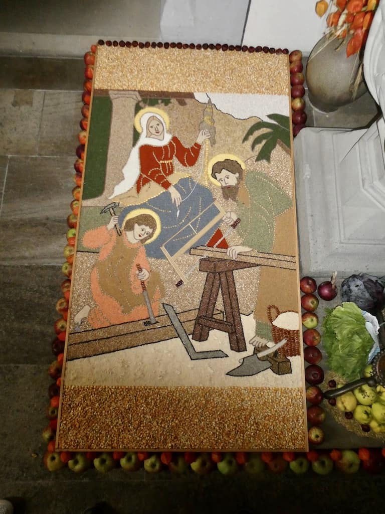 Ebenso hat uns das Kunstwerk zum Erntedankfest fasziniert. Ganz aus Mais und anderen Körnern hergestellt. Auch der Altar ist sehr schön.