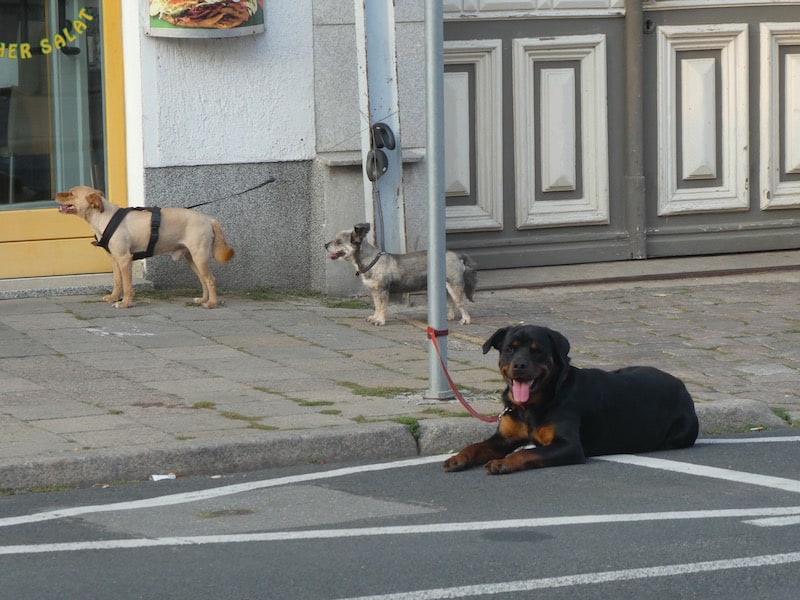 Auf dem Rückweg müssen wir einmal die Strassenseite wechseln. Dieser Rottweiler ist uns zu scharf.