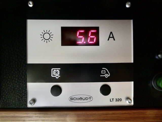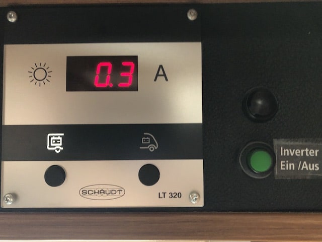 Über unseren zusätzlichen BatterieComputer können wir den Zustand der Batterien jederzeit überwachen: die Spannung, den Lade-, bzw. Entladestrom und mehr. Die Solaranzeige meldet den von unserem 100 Watt Solarpanel produzierten Strom. Das kann bei starker Sonne schon mal gegen 6 Ampere sein. Bei bedecktem Himmel natürlich entsprechend weniger und bei Regenwetter gar nix mehr. Auf dem BatterieComputer sind der Ladestrom und der Ladezustand zu sehen. Der momentane Stromverbrauch kann auch abgelesen werden. Ebenso wieviele Stunden die Batteriekapazität beim momentanen Verbrauch noch ausreichen wird. Das ist sehr beruhigend und in meinen Augen deshalb eine sich lohnende Investition. Die von LMC bei uns, wie bei den meisten anderen Herstellern, serienmässig verbaute Batteriekontrolle am Bedienungspanel ist ohne einen Shunt einfach zu ungenau. Nur durch den Shunt wird der tatsächlich fliessende Strom gemessen.