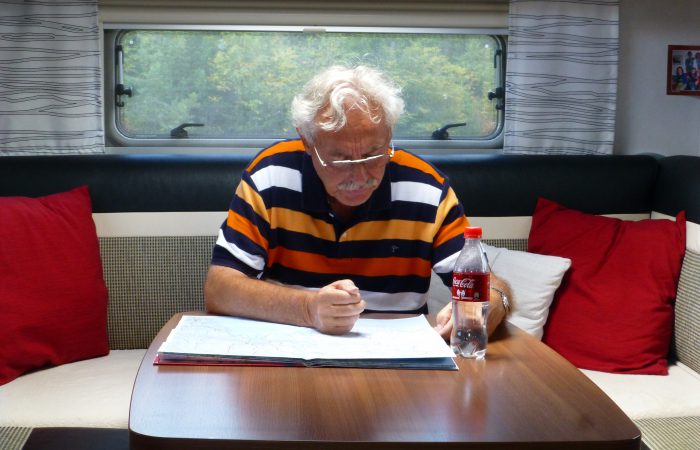 Händlers, der Standplätze zur Verfügung stellt. Einmal mehr gab es einen malerischen Sonnenuntergang und Michael hatte Zeit sich in die Landkarte zu vertiefen.