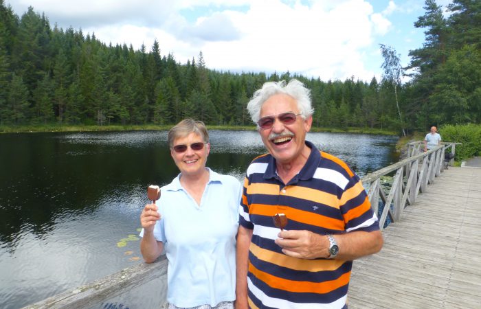 Unterwegs an einem wunderbaren Rastplatz an einem See fotografierte uns ein Norweger beim Eisschlecken. Er war früher geschäftlich viel in Bern gewesen.
