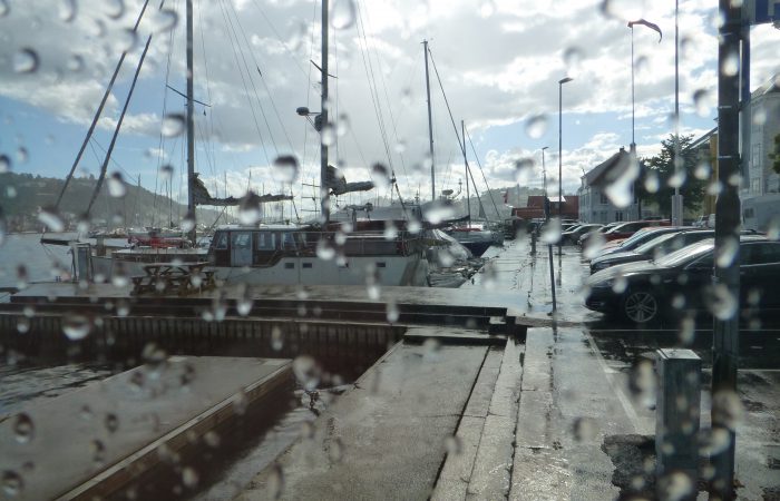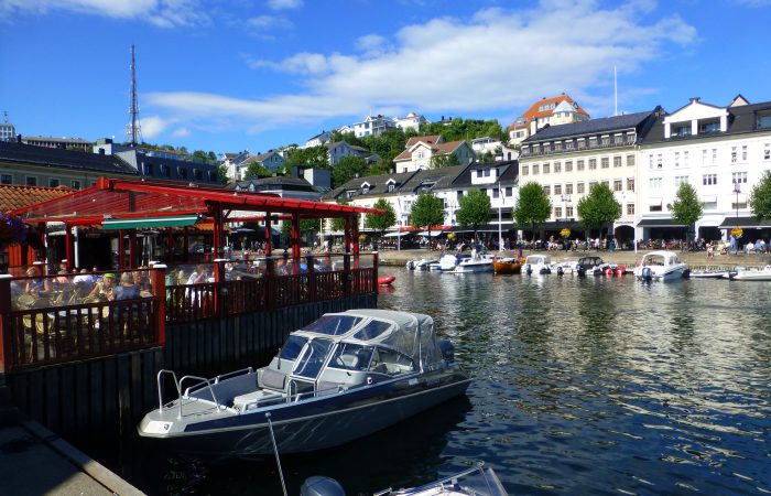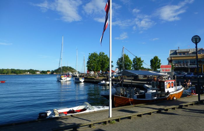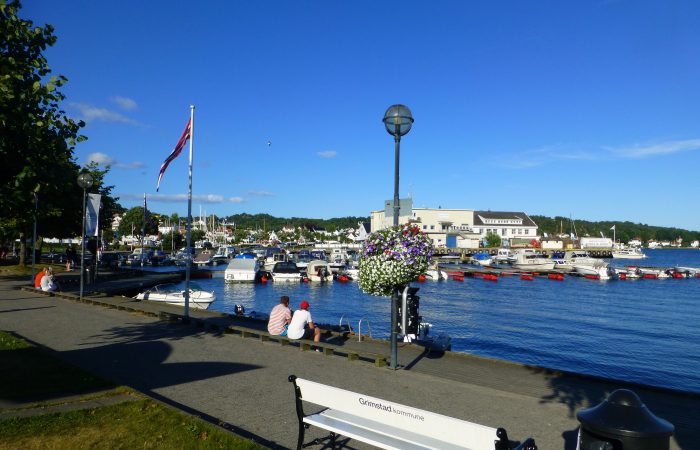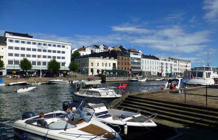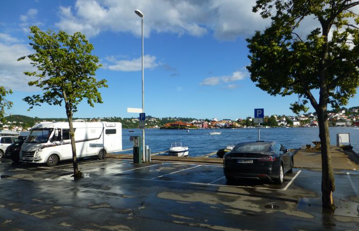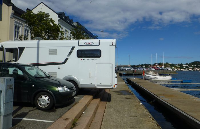 Arendal an der Nordsee (Skagerrak) fanden wir einen zentralen Parkplatz beim Hafen, aber unser Heck hing fast auf dem Bootssteg.