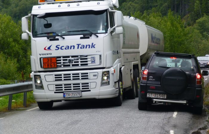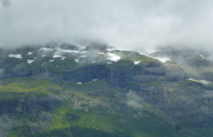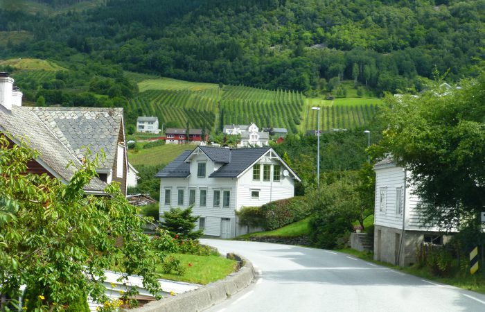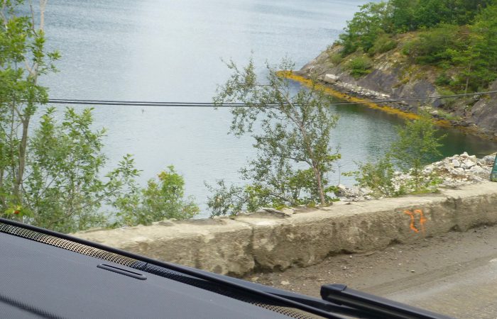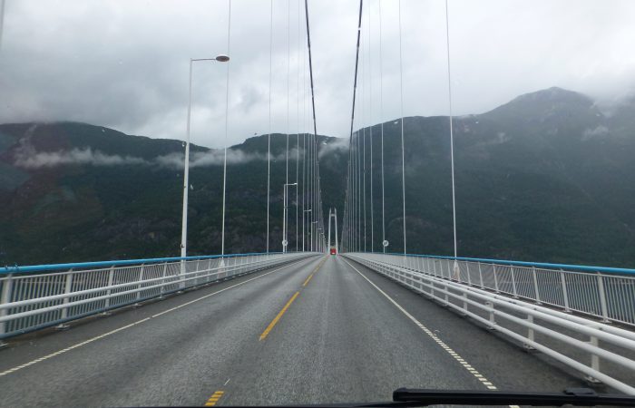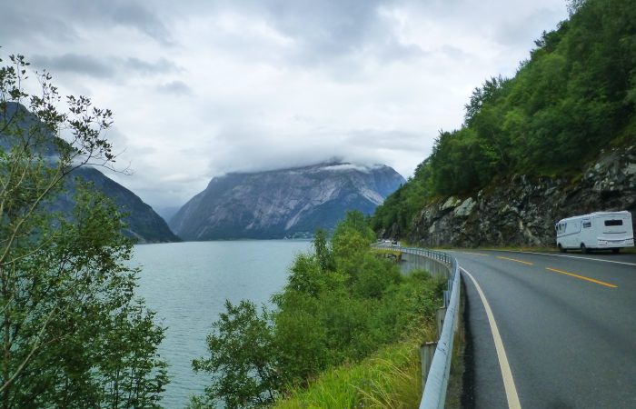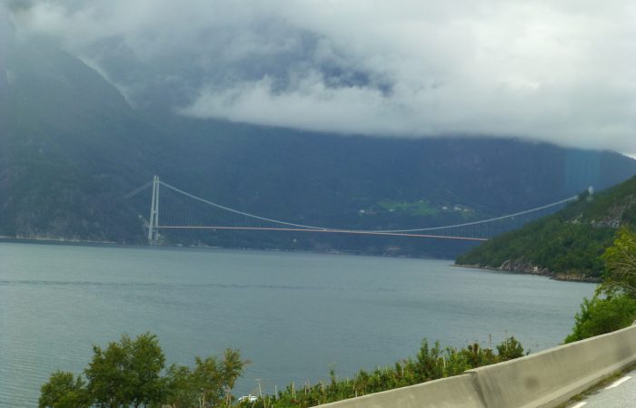 schmalen Strasse, oberhalb am Sørfjord entlang. Das Kreuzen mit dem Gegenverkehr ist immer wieder spannend. Heute, Montag, kamen als