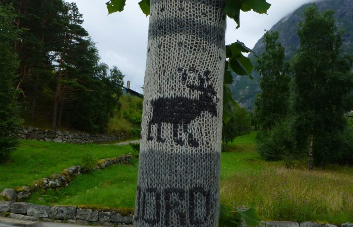 Hier waren die Bäume mit gestrickten „Wollmänteln“ gegen Kälte geschützt. Noch oder schon wieder?