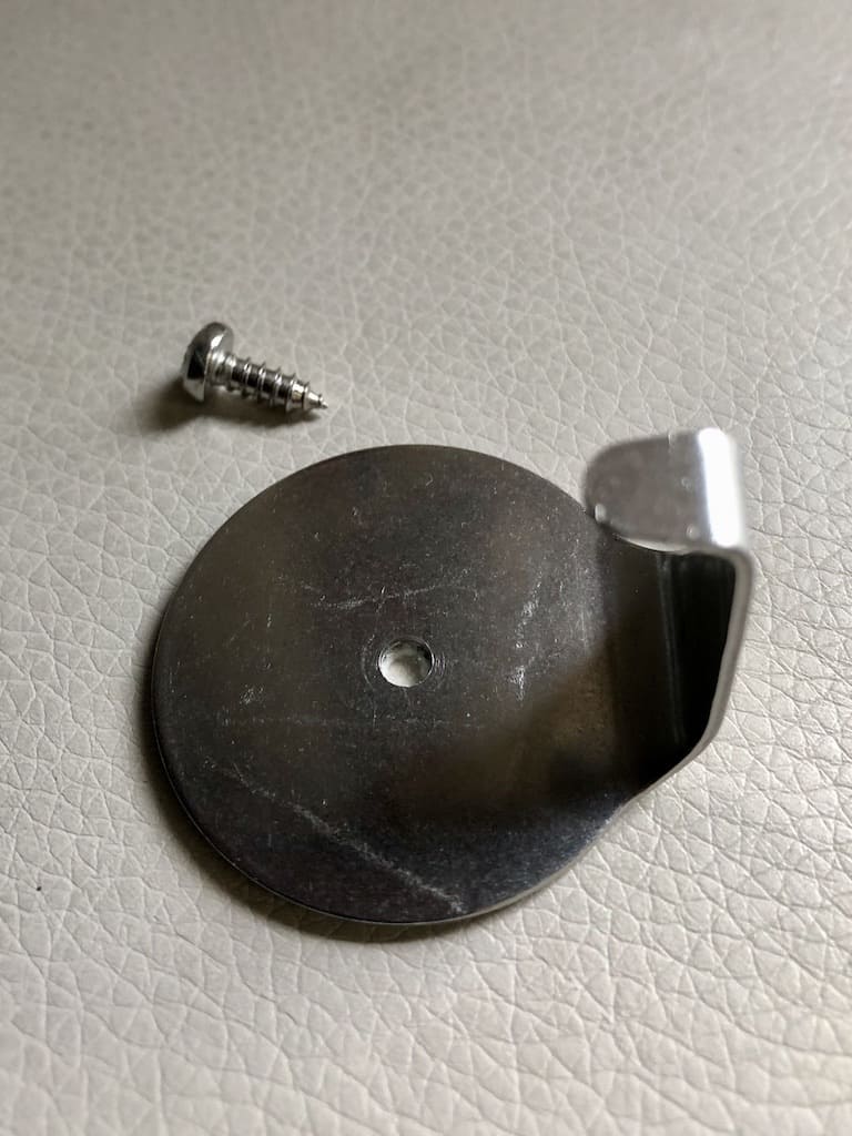 Diese Chromstahl-Haken zum Aufkleben erhält man (ohne Loch) im Handel. Die Aufhänger-Form wurde von rund auf eckig verändert.
