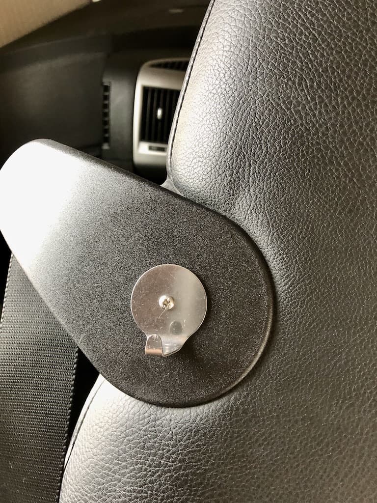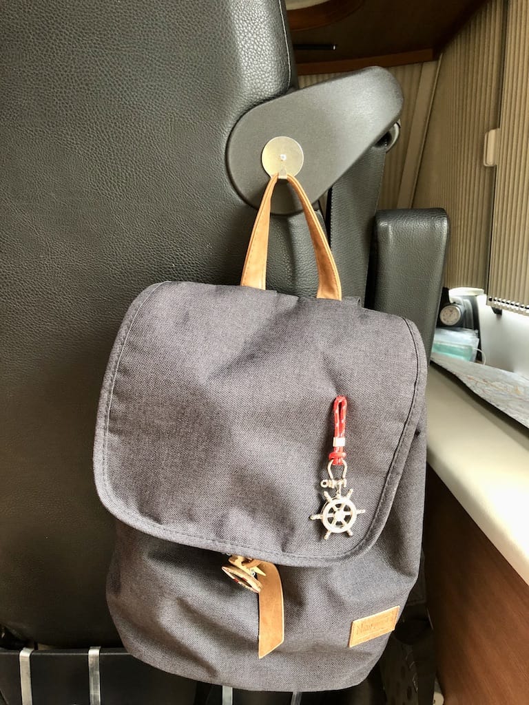 In einem Camper sind die Staumöglichkeiten nicht mit zuhause vergleichbar. Deshalb müssen wir jede Möglichkeit aussschöpfen, um gewissen Gegenständen einen festen Platz zu verpassen. So entstand diese Idee mit den Haken an den Rückseiten der Sitz-Rückenlehne.