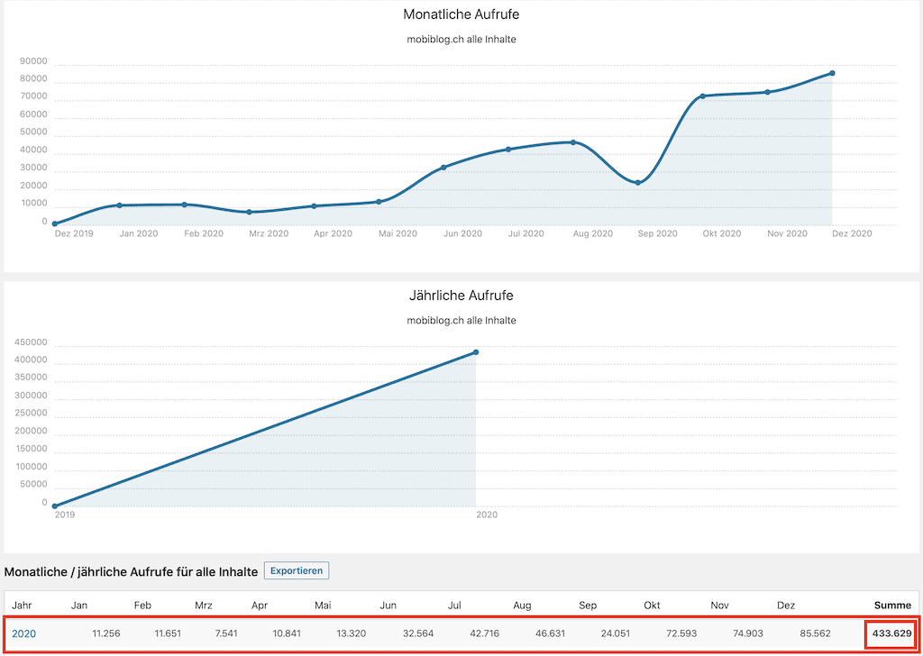 Eine positive Bilanz zeigt jedoch das Interesse an unserem Blog. Der wurde in diesem Jahr recht oft beachtet. Über 430’000 Aufrufe sind in diesem Jahr zusammen gekommen (diese Statistik läuft erst seit Ende 2019, seit der Umstellung auf das neue Design). Es freut uns natürlich, dass offenbar Ø über 8’000 Aufrufe pro Woche oder Ø fast 1’200 Aufrufe täglich erfolgten. Vielen Dank für euer Interesse.