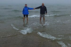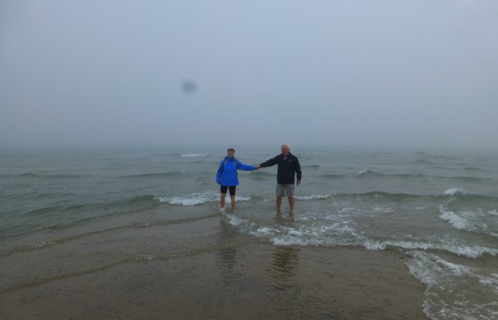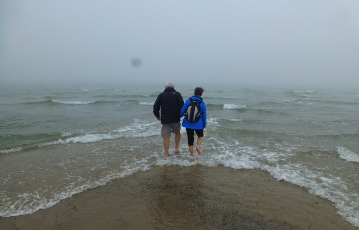Haare wurden feucht. Natürlich liessen wir das obligate Foto machen, wo wir beide in verschiedenen Meeren stehen. In Skagens Hafen