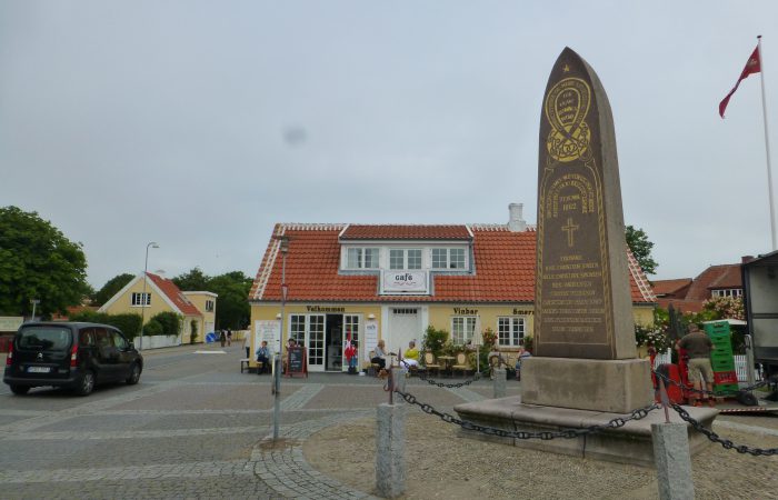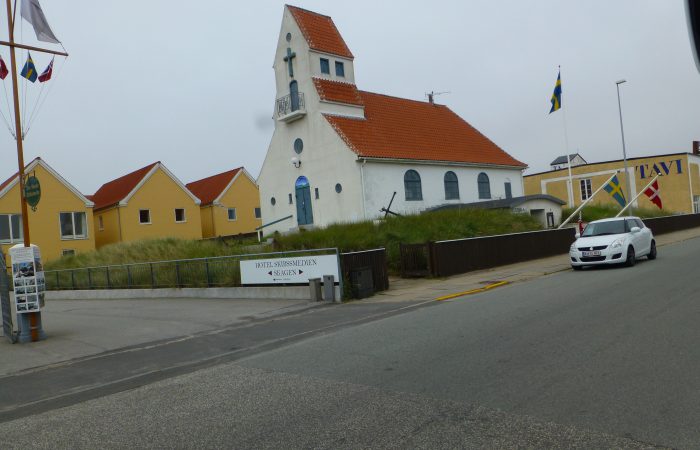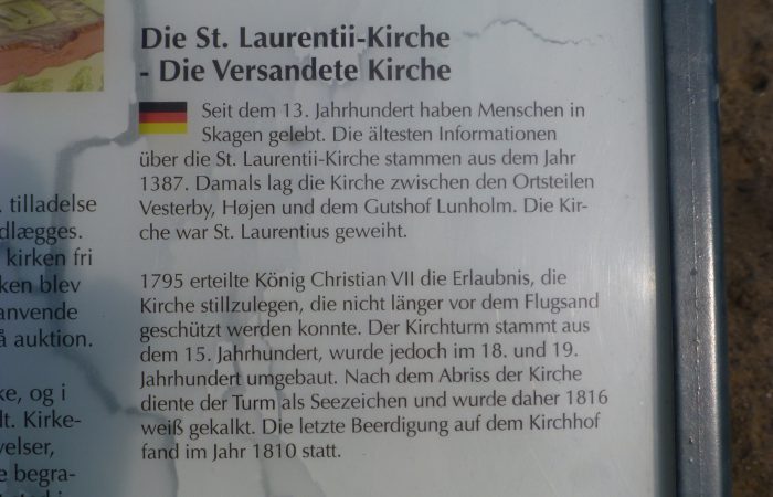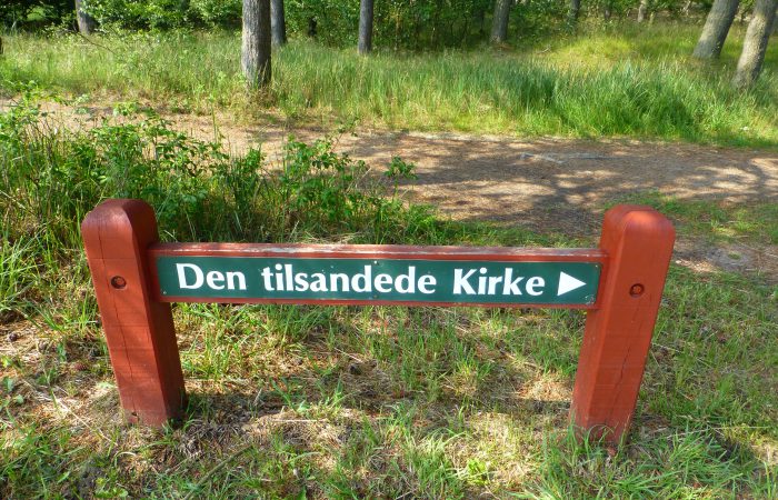 besuchten die von Sandflug verdeckte alte Kirche des Bezirks Skagen, die 1795 aufgegeben wurde und wovon nur noch der Turm in den Dünen steht. Dann fuhren wir zu