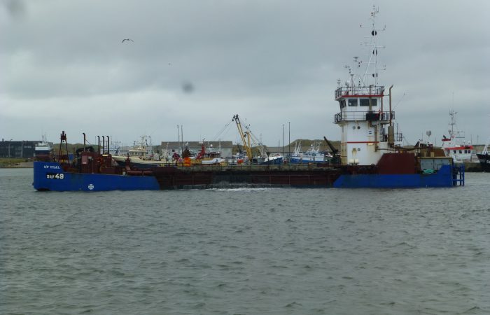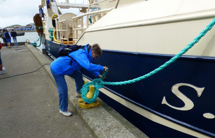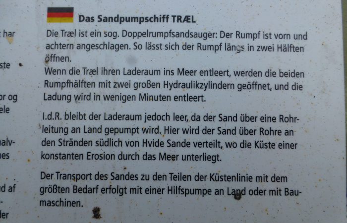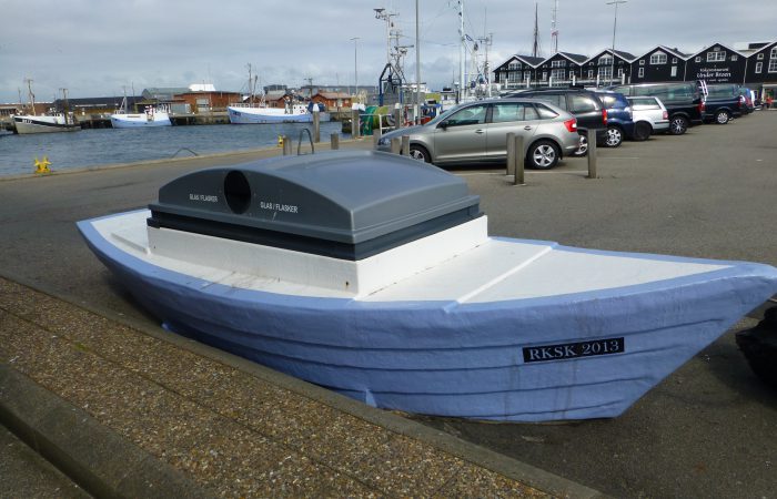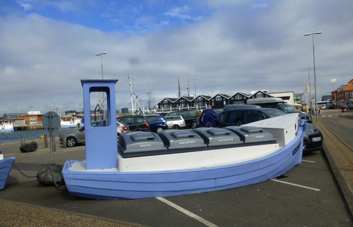 an einem Fischerboot erst enmal den Knoten zuende. Wir sahen das Sandpumpschiff TRÆL bei der Arbeit. Sehr originell fanden wir die Abfallbehälter, eingebaut in schmucken Booten.