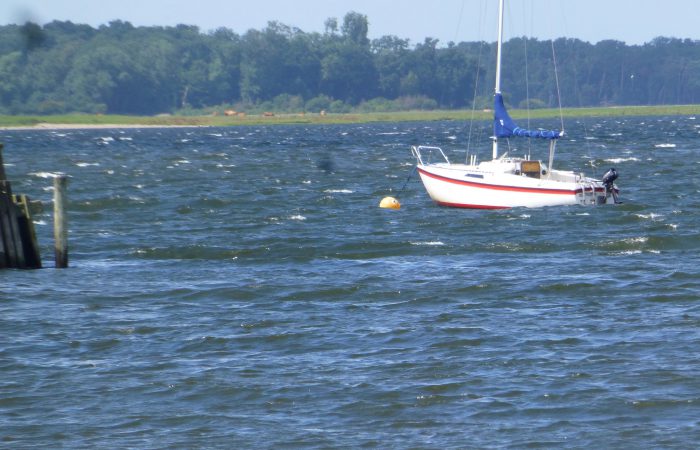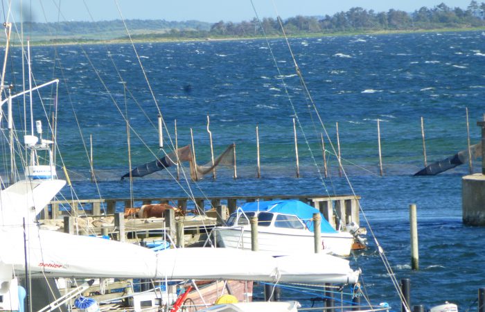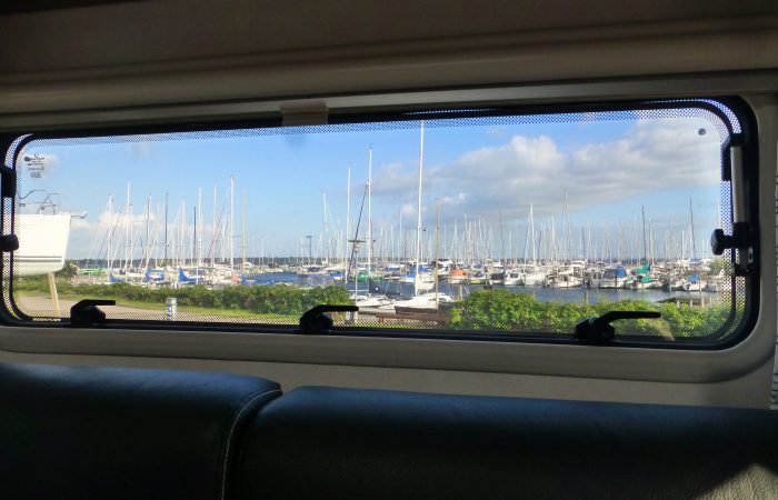 Ohne Wehmut kehrten wir zurück in unsere Landyacht und genossen von hier noch den schönen Rundumblick. Der starke Wind heult in den Wanten und Masten bis zu uns herüber. Wir jedoch stehen ganz ohne Krängung und Rucken in den Leinen.