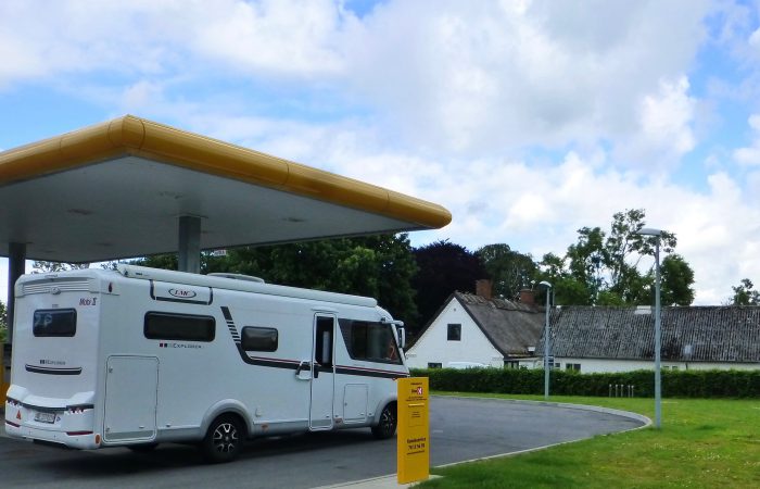 Unser Nachtquartier fanden wir in LYNÆS, an der Mündung des Ise Fjords, beim Yachthafen. Wir sind das einzige Reisemobil hier. Es hat Strom, sanitäre Anlagen und eine Entsorgungsstation.
