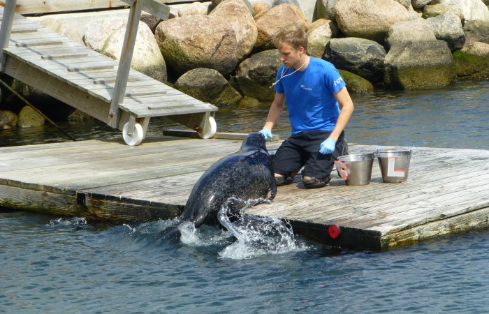 Tauchers. Im Aussenbereich schauten wir bei der „Trainings-Fütterung“ der 3 Robben zu. Auch dazu wurde wieder viel erzählt, was uns unverständlich blieb.