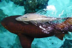 Haien hindurchläuft, die majestätisch ihre Kreise ziehen. Später sahen wir bei deren Fütterung zu. Das Zuschnappen nach dem Futter erinnert an einen