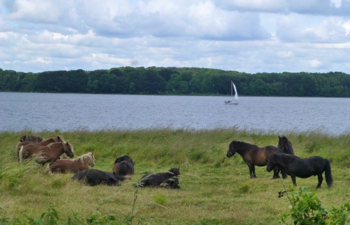 Ort um länger zu verweilen. Aber der Weg dorthin, am Fjord entlang, war sehr schön. Das zeigt ein Bild mit den Pferden im Vordergrund, derweilen ein Segler dahinter nur mit Vorsegel gute Fahrt macht.