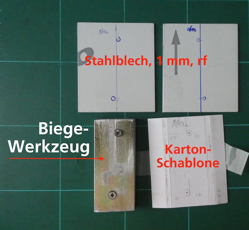 Um die Halterung aus 1 mm Stahlblech mit meinen bescheidenen Mitteln biegen zu können, habe ich ein Biegewerkzeug gebastelt: Zwei Flacheisen in der Stärke der Kunststoff-Flachstange mit Gewindeschrauben. Die Stahlbleche werden dann einzeln dazwischen geschraubt, damit sie beim Biegen nicht verrutschen. Eines wird, – im Schraubstock eingespannt-, nach vorne gebogen und eines nach hinten. So entsteht eine rechte und eine linke Halterung.