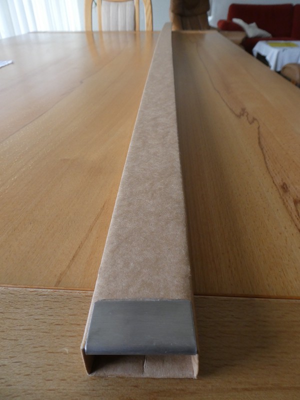 Drei Teile, aus der Verpackung des grossformatigen Kalenders der „Jungfrau-Region“ geschnitten, ergeben zusammengeklebt gerade die richtige Länge. Die vorne beim Einschieben exponierte Kante wurde mit einem Stück Stahlblech verstärkt. – Fertig!