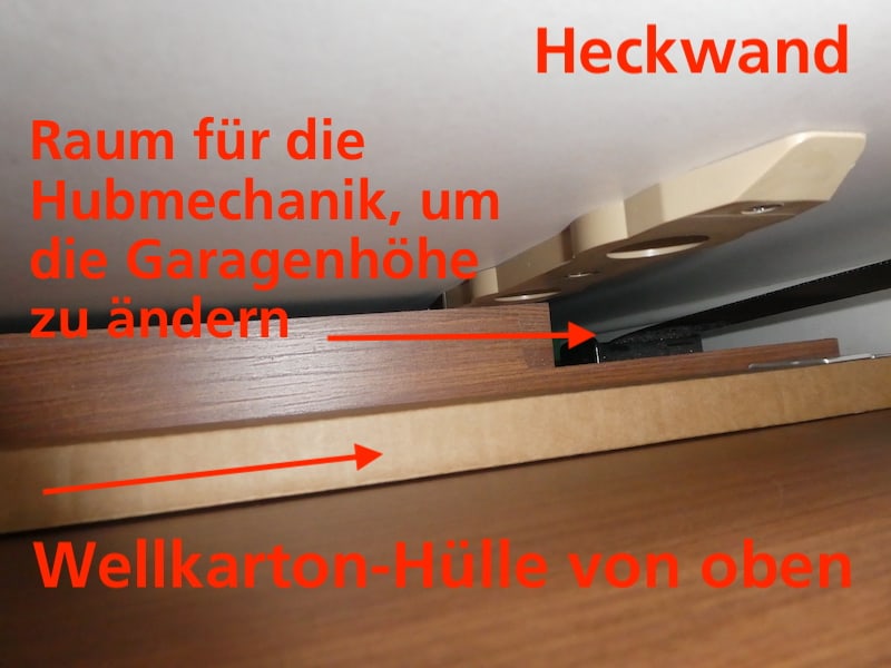 Ein geeigneter Platz für die Lagerung findet sich zwischen der Heckwand und dem Heckbett, bzw. der Hecksitzgruppe. Dort ist wegen der Hubbett-Mechanik genug Raum. (Mit dieser Mechanik könnte man die Garage elektrisch in der Höhe vergrössern, was wir aber nicht brauchen).