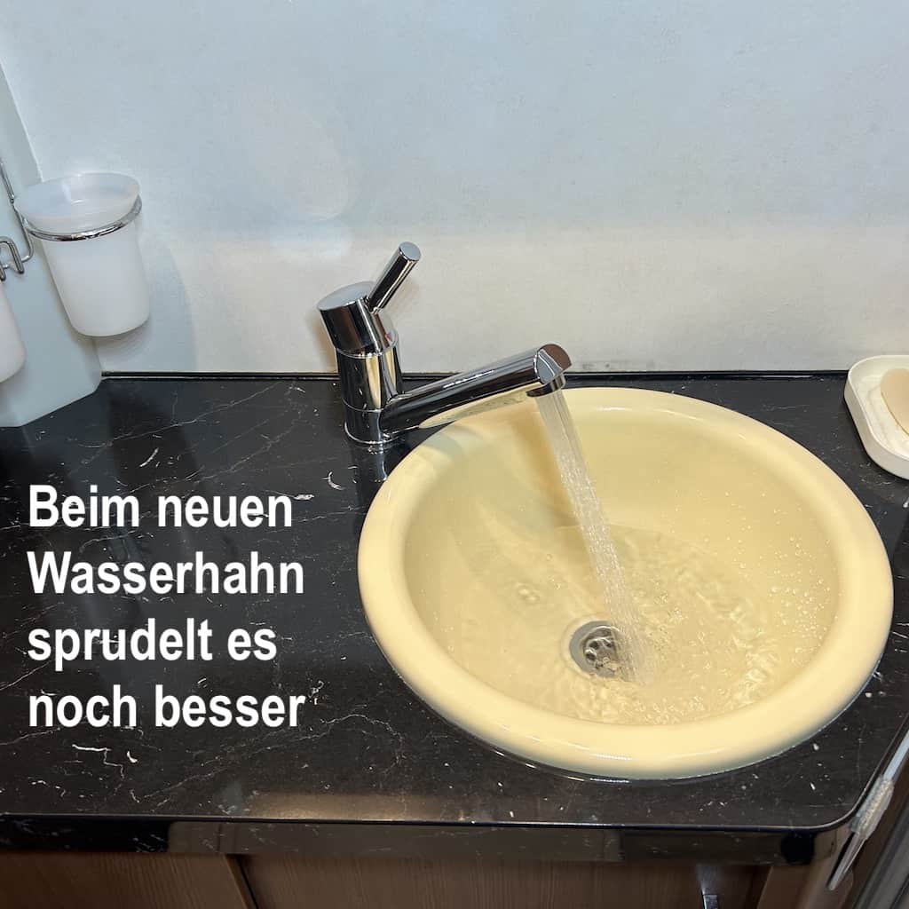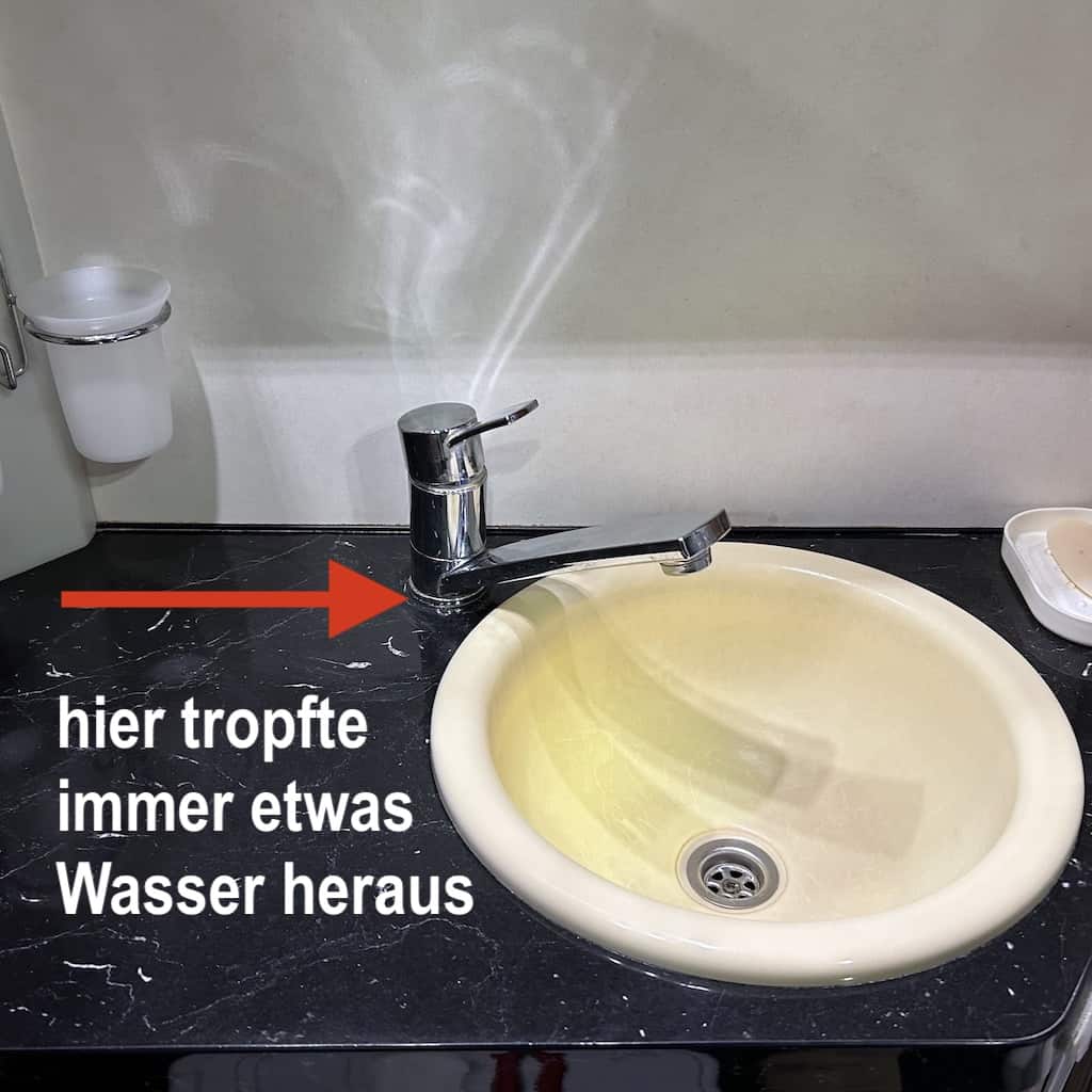 Als wir unterwegs bei einem LMC-Händler nach einer Lösung fragen, rät uns dieser zum Ersatz der ganzen Mischgarnitur. Es gibt zwar Ersatz für die Keramik-Kartusche, aber vielfach ist das auch nicht die Ursache für diese kleine Leckage. Der Aufwand einer Teilreparatur lohnt sich also nicht.