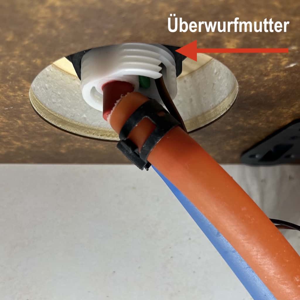 Die Überwurfmutter lässt sich mit einer Gegenbewegung der Armatur von oben wieder genügend fest von Hand anziehen.