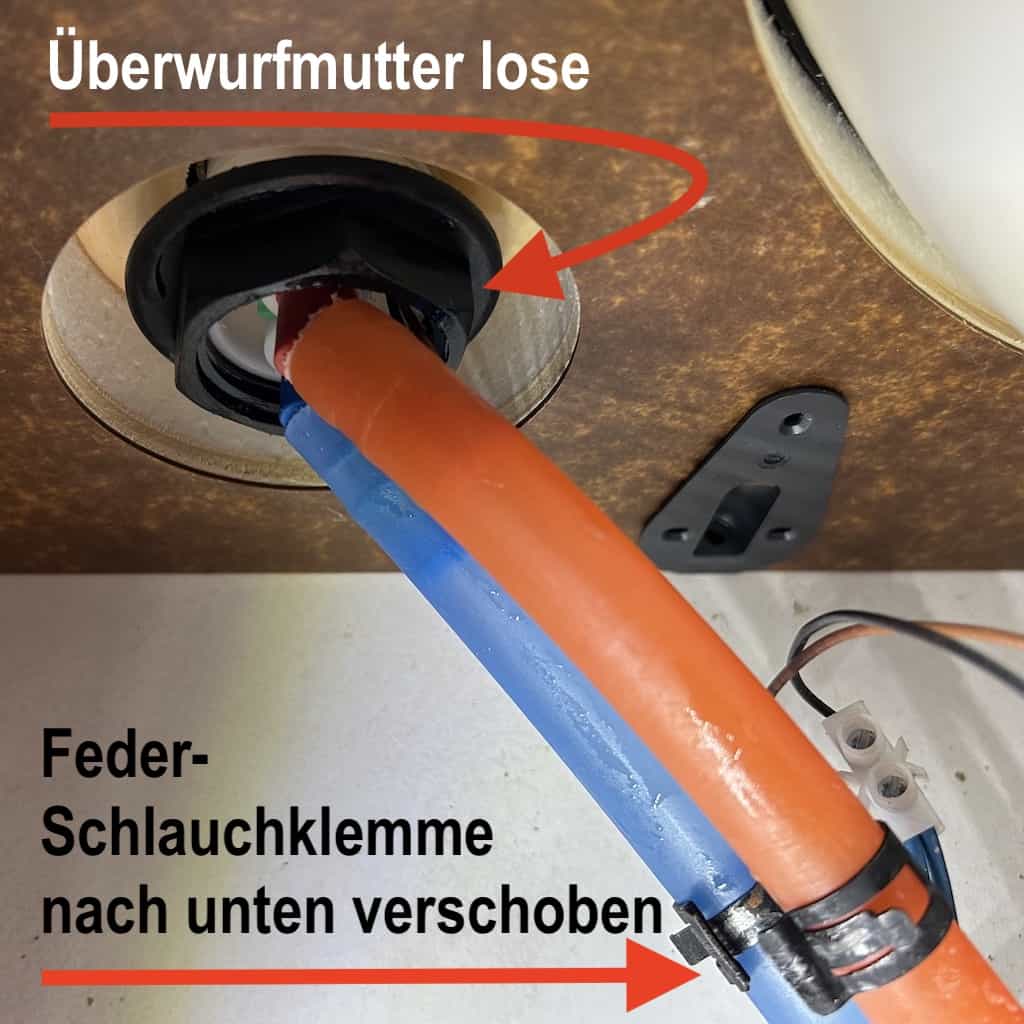 Die Federschlauchklemmen kann man mit einer Flachzange aufdrücken und nach unten ziehen.