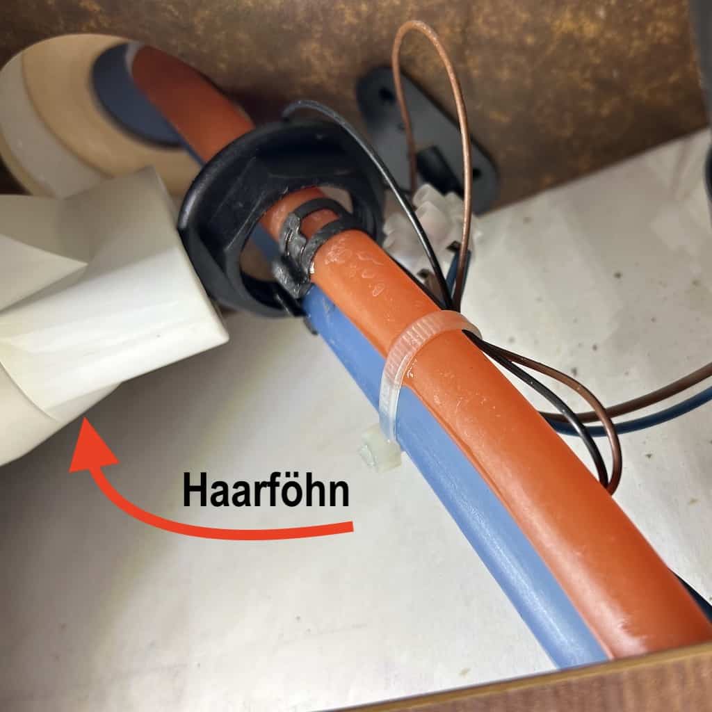 Die Wasserschläuche aus Hartplastik lassen sich nur sehr schwer von den Anschluss-Nippeln abziehen. Man kann in diesem engen Raum auch nicht gut anpacken. Letztendlich hilft ein Erwärmen der Schläuche mit einem Föhn. Dadurch wird der Kunststoff etwas weich und dehnfähig und das Abziehen gelingt.