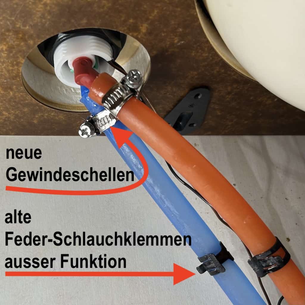 Die ehemaligen Feder-Schlauchklemmen werden bei mir nicht mehr verwendet. Zu gross sind die Bedenken, den Anschluss wegen der alten eingeprägten Rillen im Schlauch nicht dicht zu bekommen.