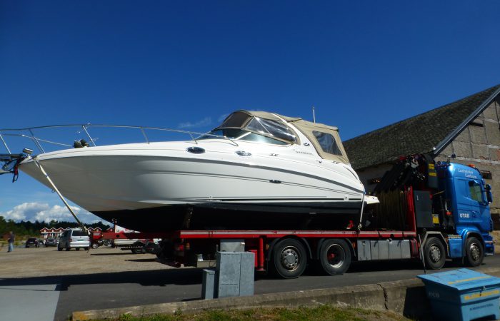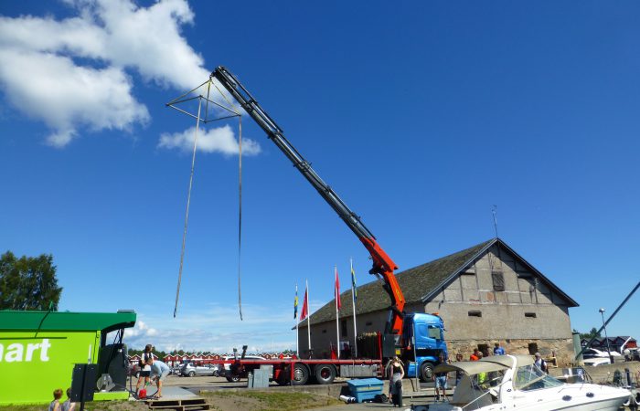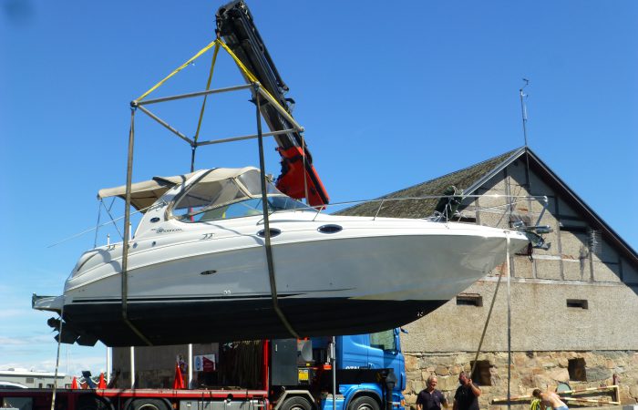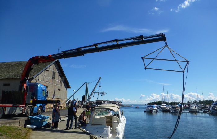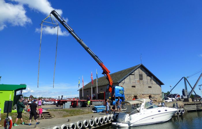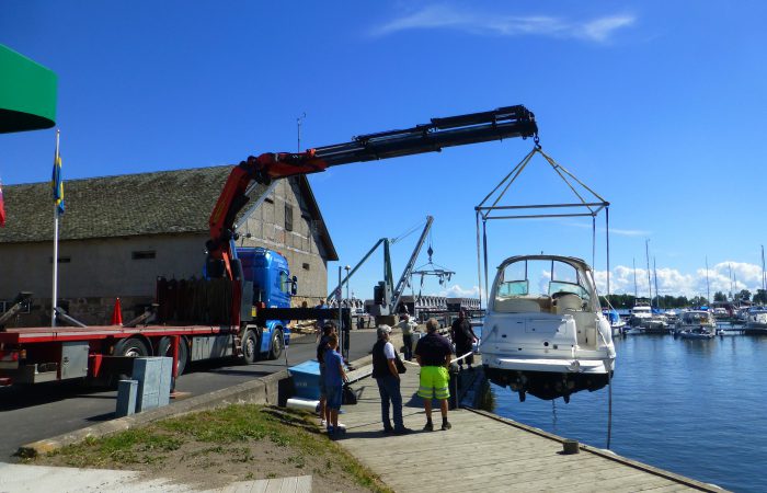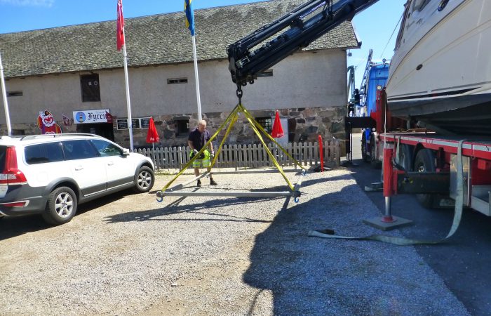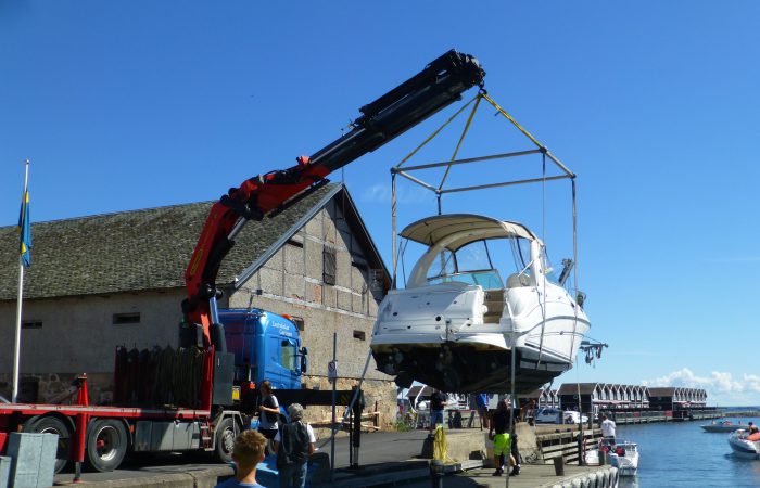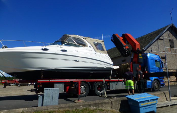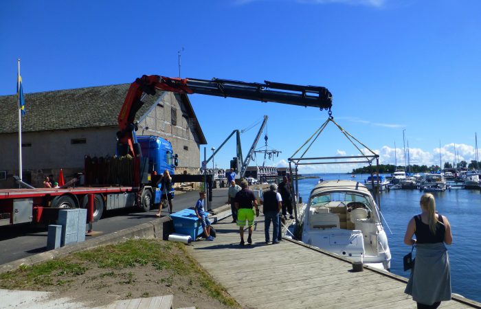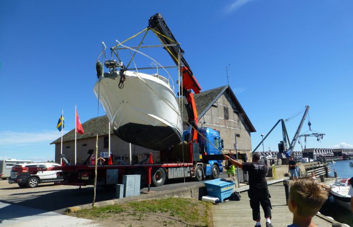 geliefert und eingewassert wurde. Der hatte einen integrierten, unscheinbaren Kran, mit dem er aber das fast 5 Tonnen schwere Boot ca. 10 Meter weit schwenkten konnte, bevor es ins Wasser kam.
