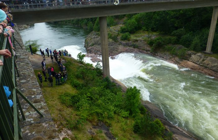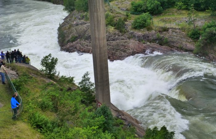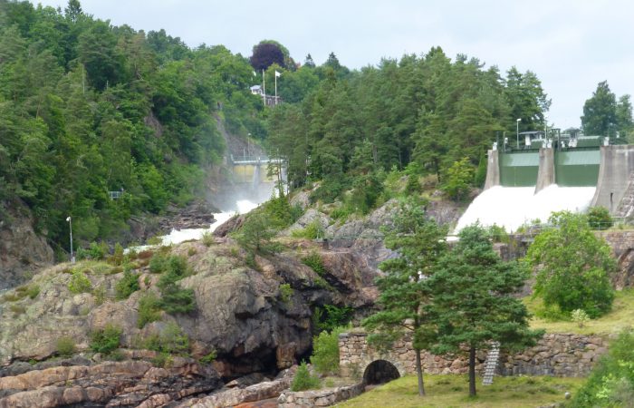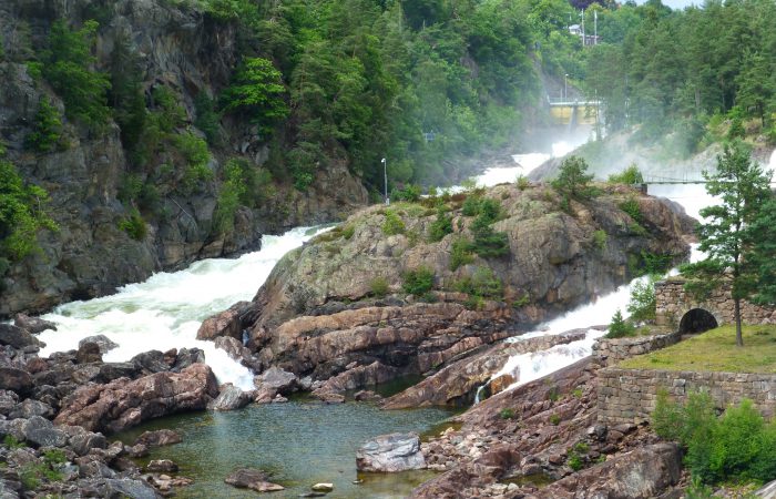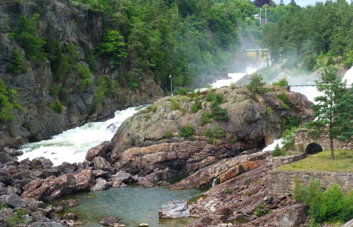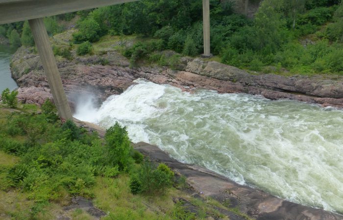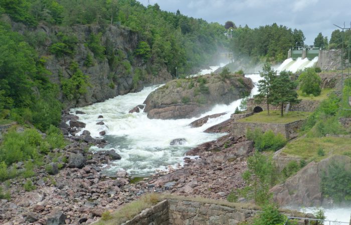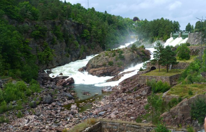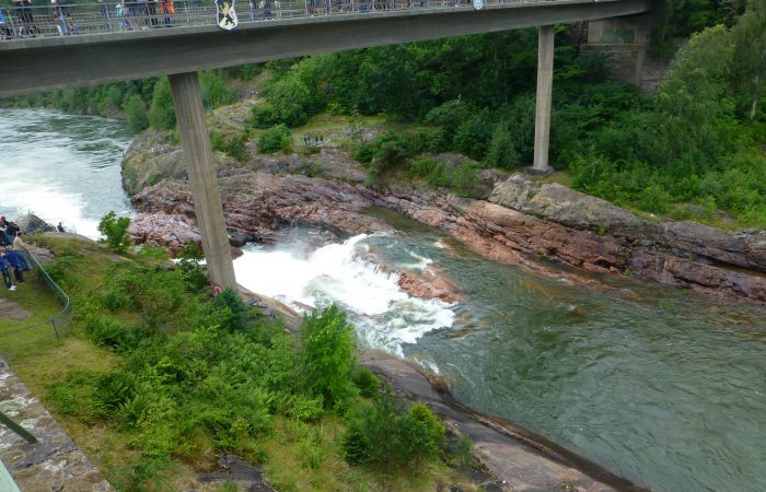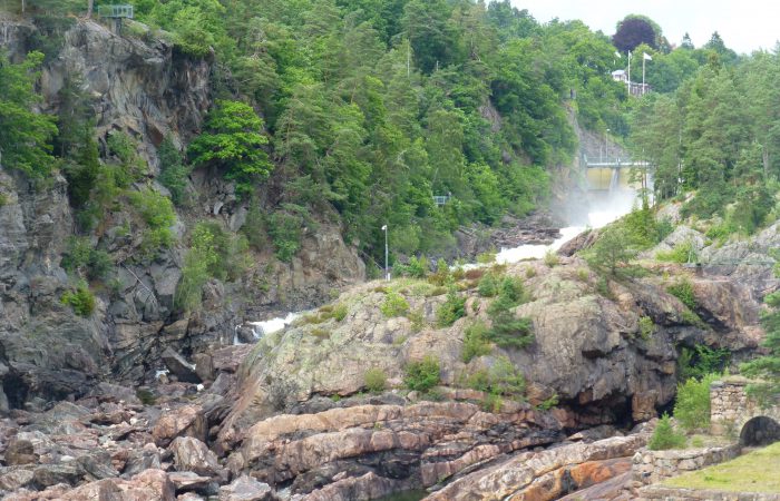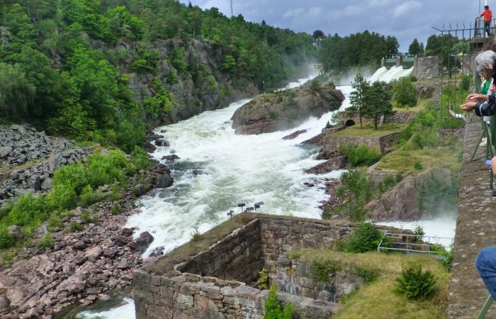 über die Felsen. Danach ist das Spektakel wieder vorbei. Der Fluss Göta Älv hat hier einen Höhenunterschied von 32 Metern. Man nutzt die Wasserkraft auch in einem unterirdischen Kraftwerk.