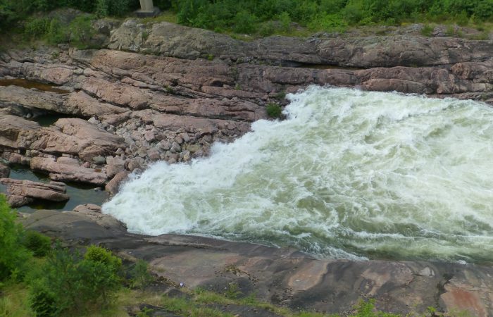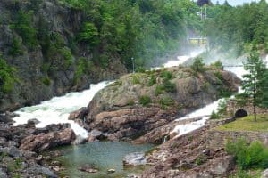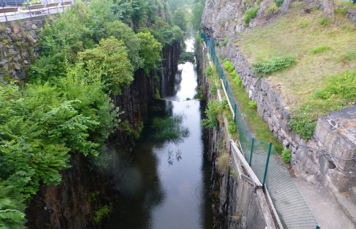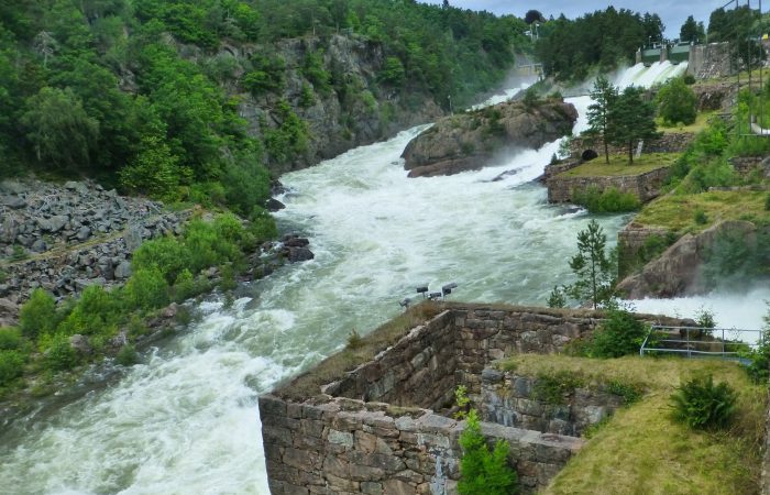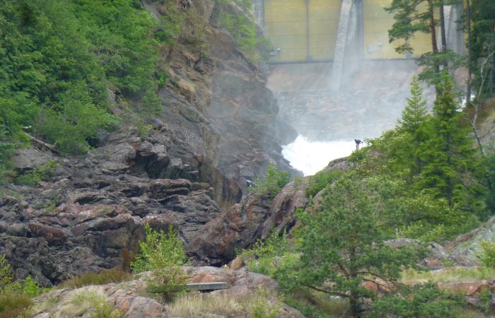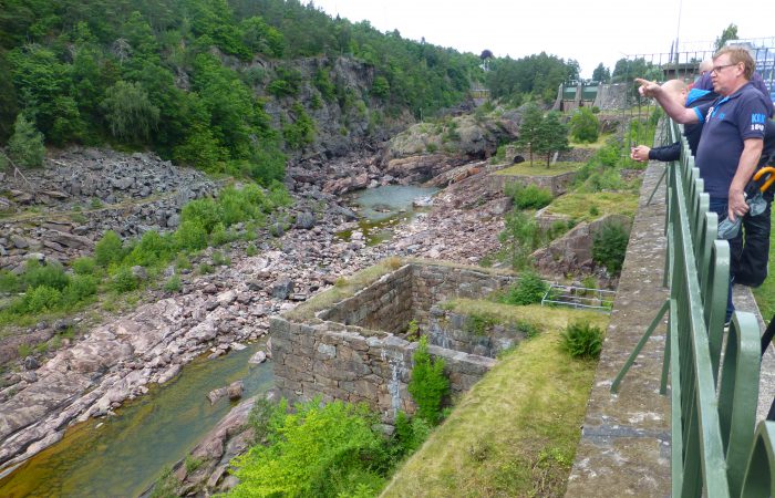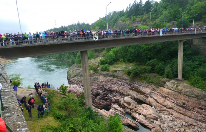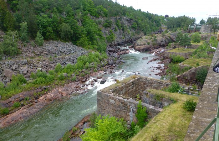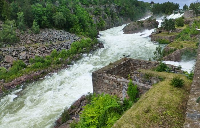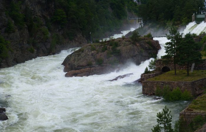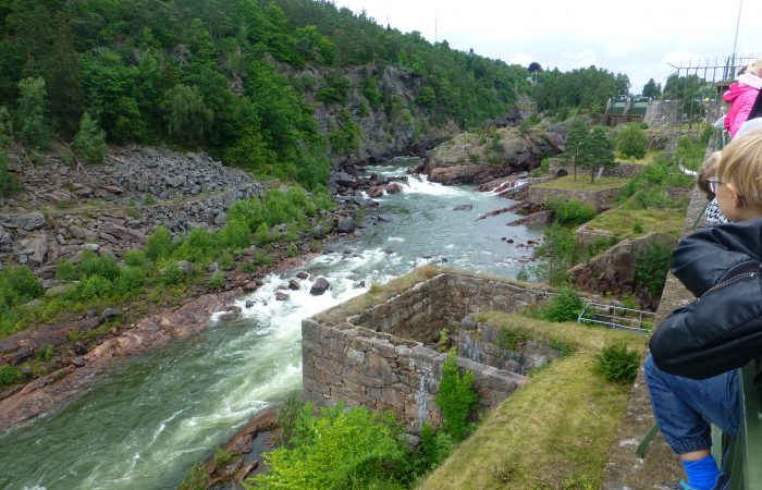 über die Felsen. Danach ist das Spektakel wieder vorbei. Der Fluss Göta Älv hat hier einen Höhenunterschied von 32 Metern. Man nutzt die Wasserkraft auch in einem unterirdischen Kraftwerk.