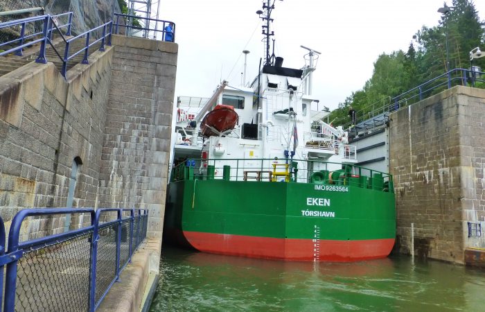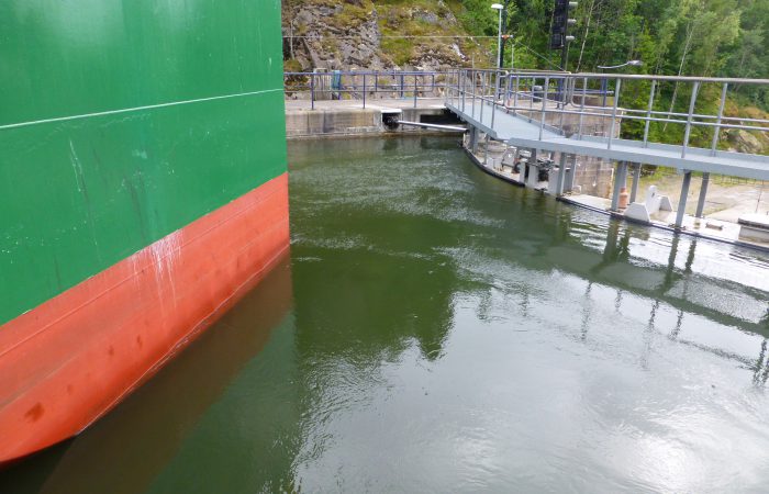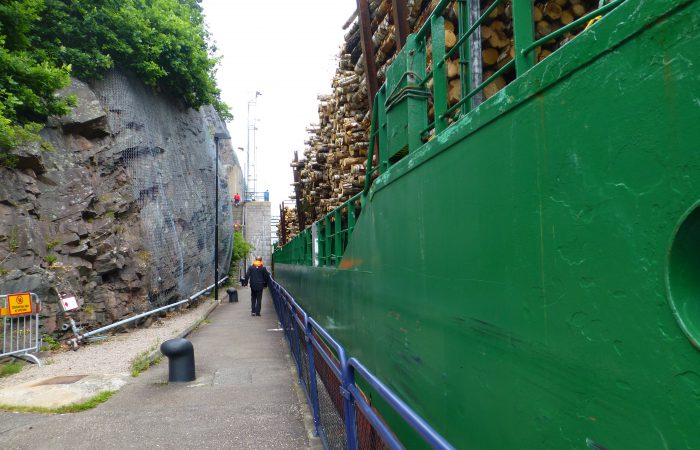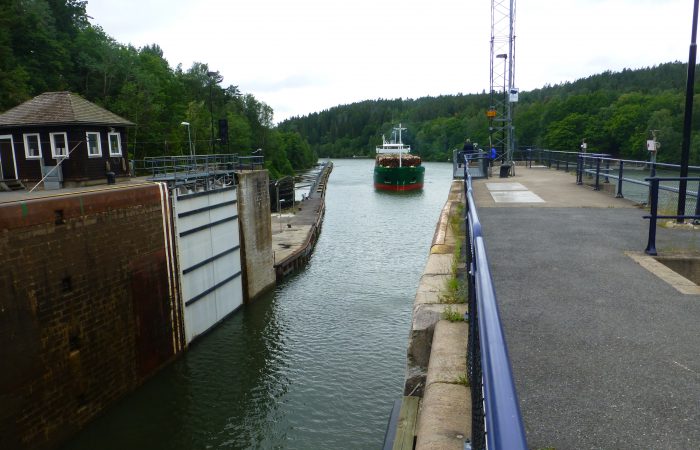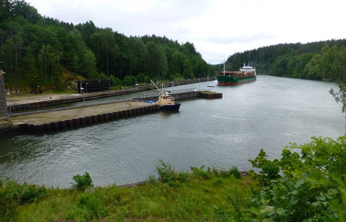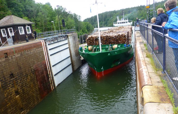 sondern auch grosse Lastschiffe mit Waren für die Industrie am Vänern See benützen diesen Weg. Wir sahen einem Schiff zu, das Holz für die
