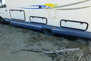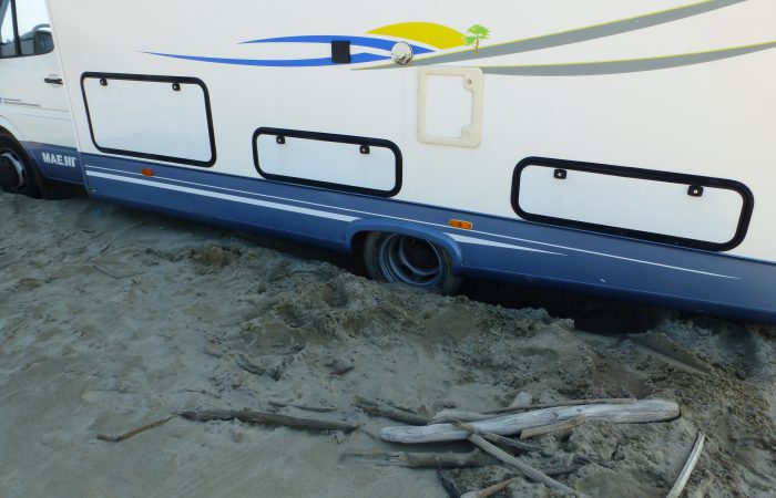 Nun sahen wir, dass ein Camper sich bis auf die Achse im Sand festgefahren hatte. Er war, wie am Vortag, an den Strand gefahren und kam dann nicht mehr weg. Ein Abschleppwagen war bestellt und sollte Hilfe bringen.