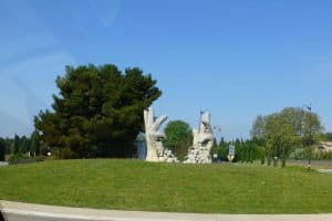 Die Kreisel in Frankreich sind grundsätzlich recht aufwändig gestaltet. So dieser hier, der den Weinbau symbolisiert.