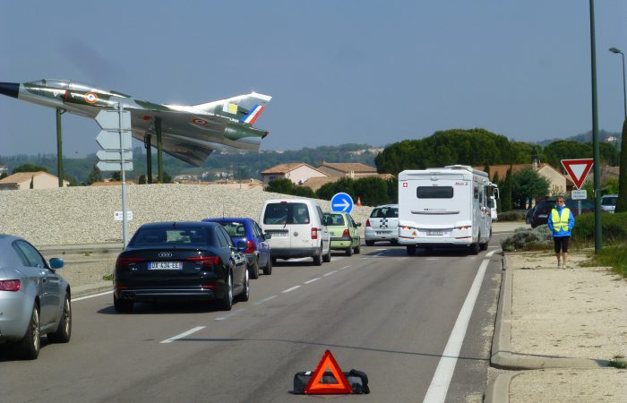 Wir standen auf der N7 bei Montélimar, zum Glück auf der rechten Spur vor einem Kreisverkehr, sodass die anderen Fahrzeuge an uns vorbei kamen.