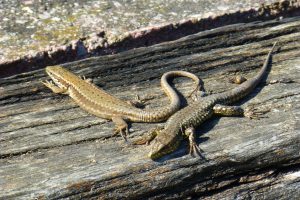 inzwischen ist es sonnig geworden, was auch diese Eidechsen genossen.