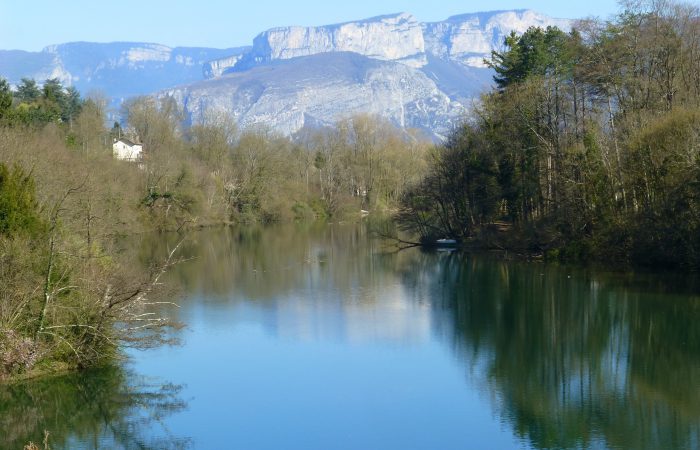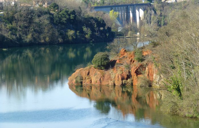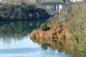 rotbraune Felsen am Ufer der Isère bei St. Nazaire