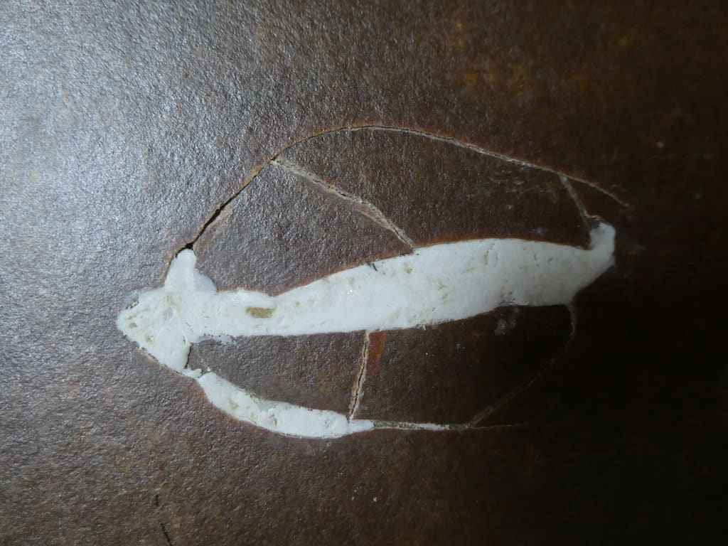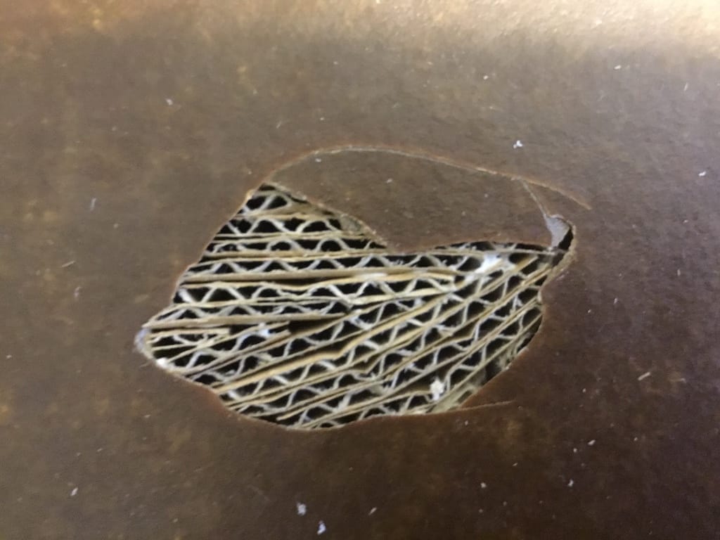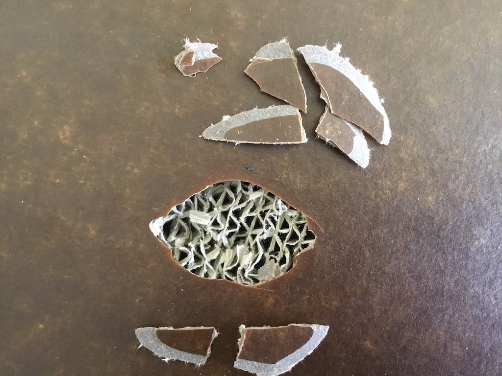 Zuerst repariere ich das Loch in der Unterseite der Tischplatte. Der gestauchte Wellkarton wird total entfernt. Wie beim Original wird dann der Hohlraum wieder mit stehenden Wellkartonstreifen gefüllt. Diese Bauweise ist dem Leichtbau geschuldet.
