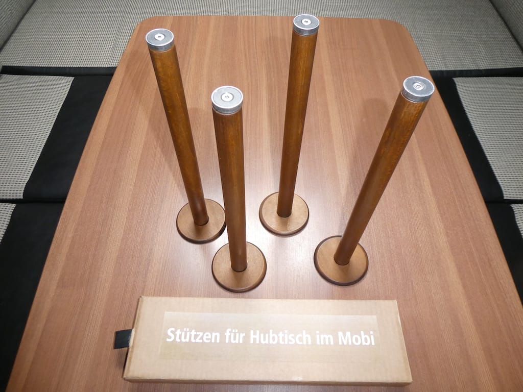 Allerdings hatte ich Bedenken, dass die Belastung zu gross werden könnte, wenn aus dem Tisch ein Bett wird. So entstand die Idee, die Last nicht allein auf den 4 Punkten der Tischfuss-Befestigung, sondern zusätzlich auf weitere 4 Stützen zu verteilen. In einem Baumarkt bekam ich für kleines Geld Stützen und Holzfüsse und mehr darüber ist in diesem Beitrag zu lesen.