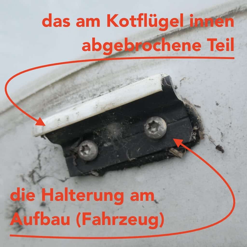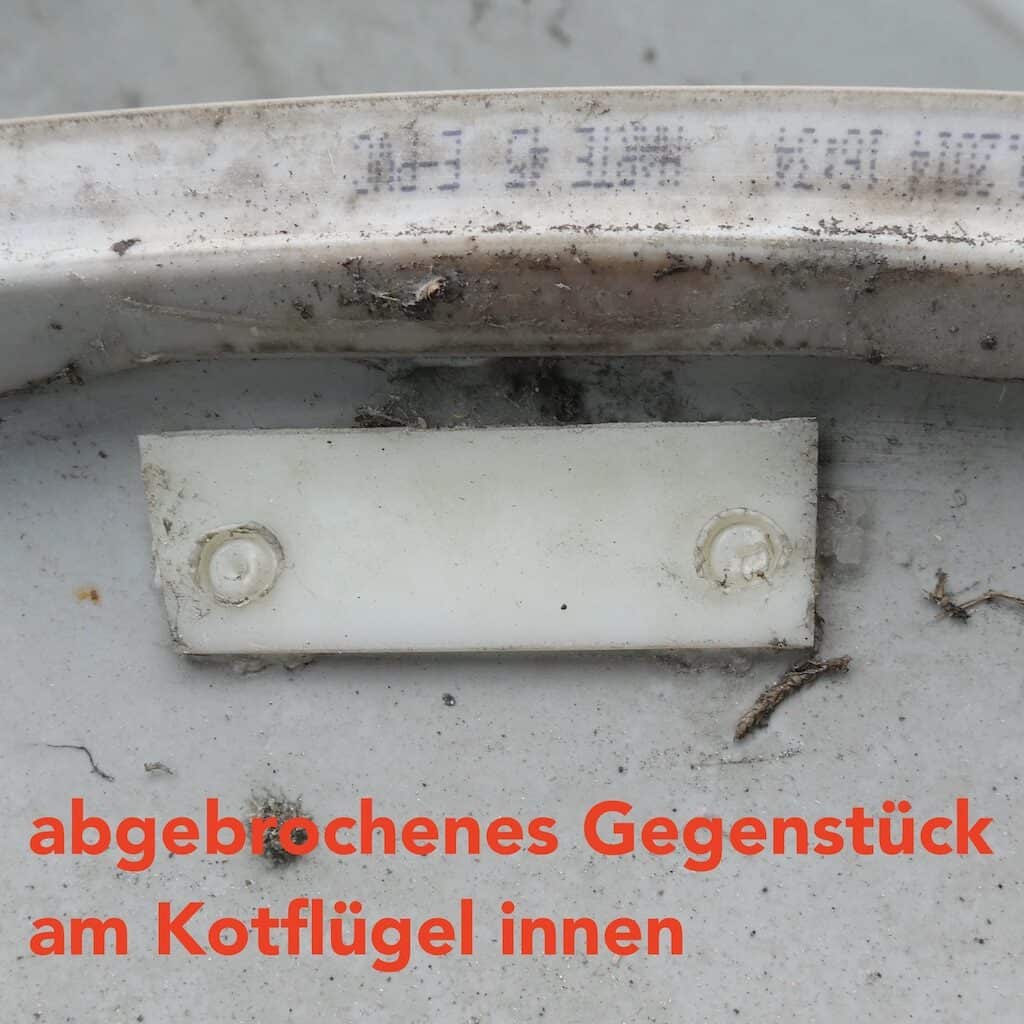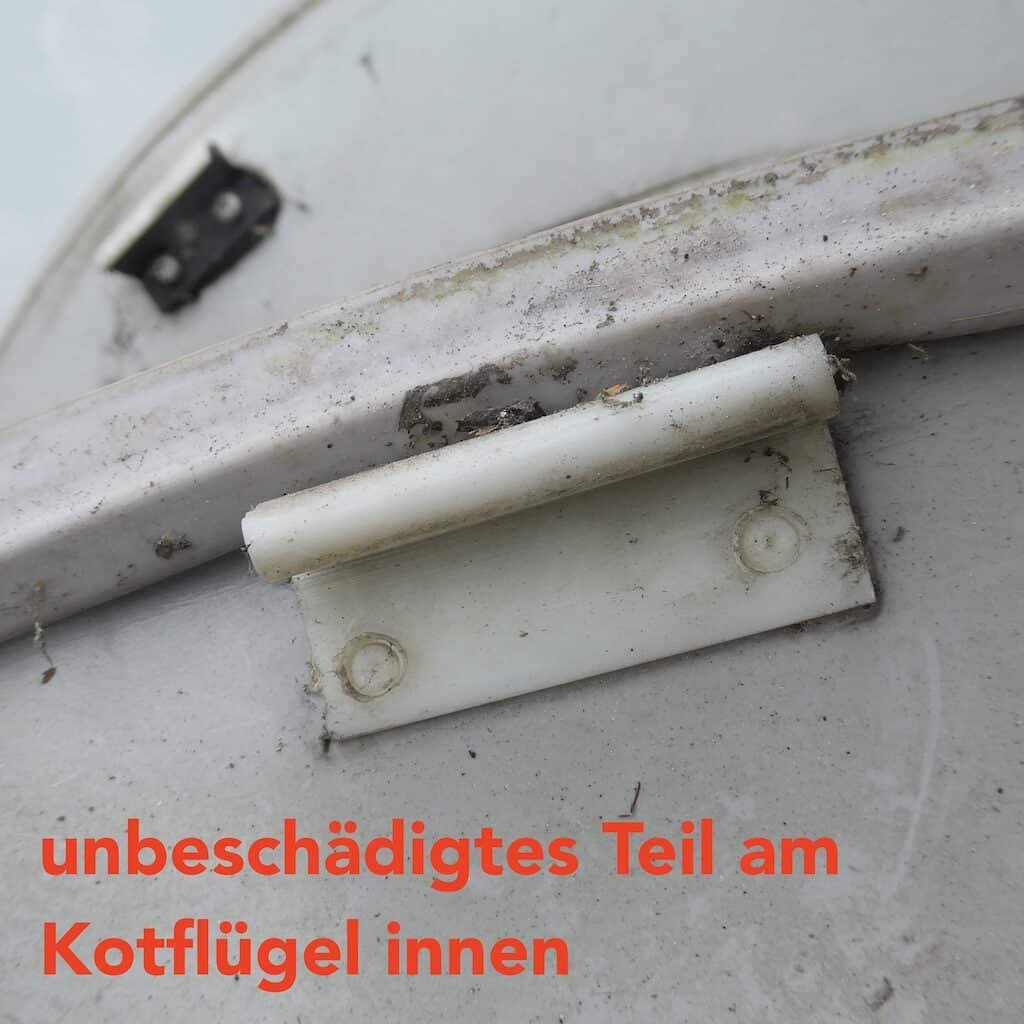 Die vorderen Kotflügel sind je an drei Punkten eingehängt. Die hinteren nur an zwei. Einer davon war bei unserem Fahrzeug auch schon abgebrochen. Also höchste Zeit, auch diese besser zu befestigen.