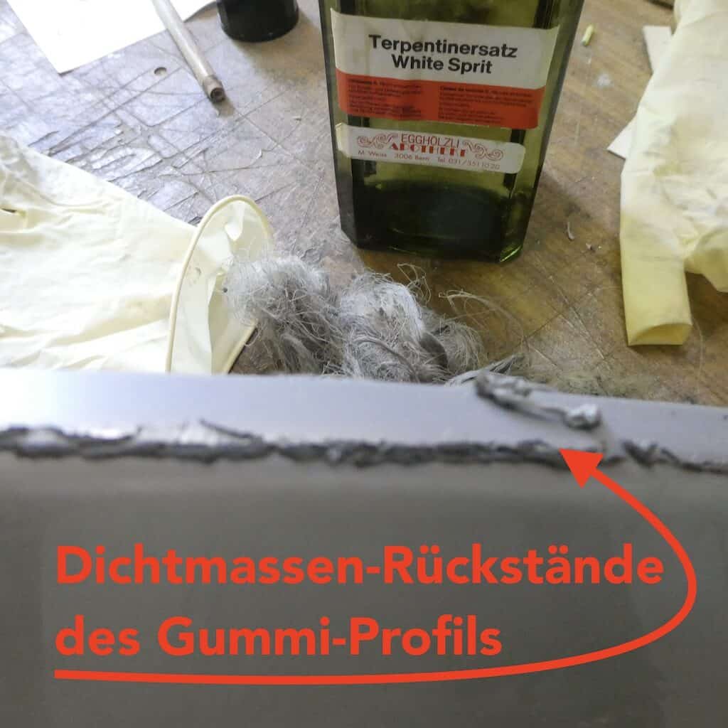Das Entfernen der alten Gummidichtung geht recht leicht. Aber die zurückbleibende Dichtmasse vom Kotflügel zu entfernen ist recht aufwändig. Mit Putzwolle, Terpentinersatz und etwas Geduld geht aber auch das. Dabei sind Gummihandschuhe zu empfehlen. Das Aufziehen des neuen Profilgummis, in dem die Dichtungsmasse bereits enthalten ist, braucht dann nochmals etwas Geschick und Geduld.