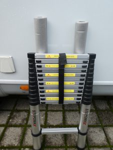 So besorgten wir uns eine Teleskopleiter, die bis auf 320 cm ausziehbar ist. Obwohl aus Alu, wiegt sie 14 kg, ist dafür aber auch sehr stabil. Allerdings bleibt sie im Sommer zuhause.