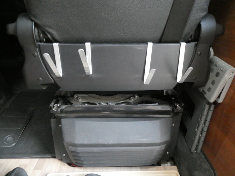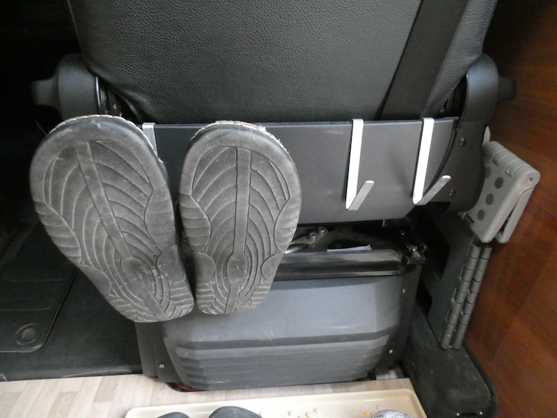 Am Sockel von Fahrer- und Beifahrersitz ist an der Rückseite etwas ungenutzter Platz. So entstand die Idee, hier mit einfachen Mitteln einige Schuhe unterzubringen. Der Rest war schnell gemacht.