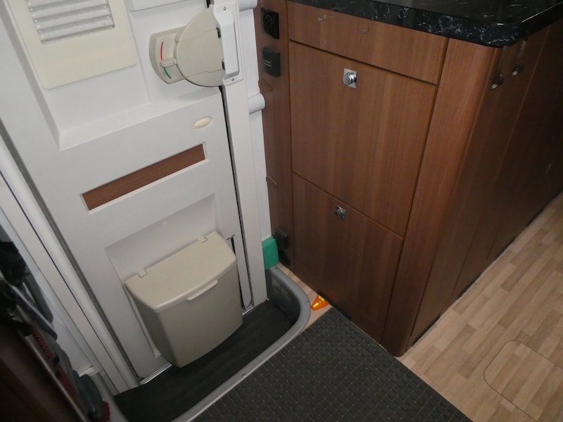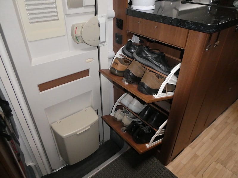 Der Hersteller LMC hat in unserem Modell Explorer 655 G ein sehr praktisches Schuhschränkchen eingebaut. Hinter jeder der zwei Klappen haben 4 Paar Schuhe bis Grösse 40 Platz. Sind die Schuhe aber grösser, wie bei den meisten Männern der Fall ist, passen leider nur noch 2 Paar hinein. Das reicht also im Normalfall bei weitem nicht aus.