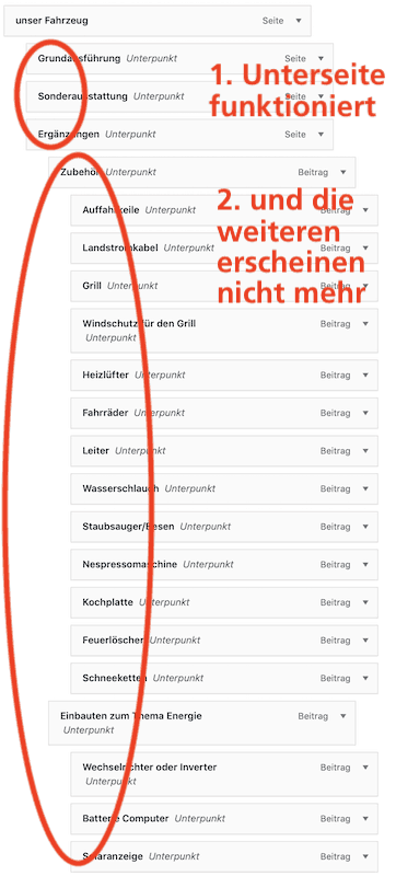 1. Schau mal unter „Design > Menüs“ Dein aktuelles Hauptmenü an, sind dort die „Unterunterpunkte“ denn vorhanden? Im sog. HTML-Code der Seite sind sie es derzeit nämlich nicht.