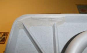 In einer Ecke ist der Rand gebrochen. Die Tischplatte ist aus einem Kunststoff unbekannter Art.