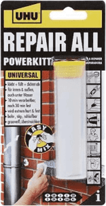 So besorgte ich die Reparaturmasse Powerkitt von UHU in grauer Farbe.