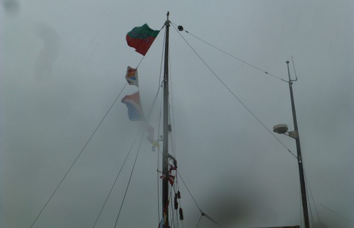 und andere Windindikatoren waagerecht auswehten. Was für ein Schietwetter. Michaels Hose, mit der er kurz draussen war, hing nun zum Trocknen. Doch da uns