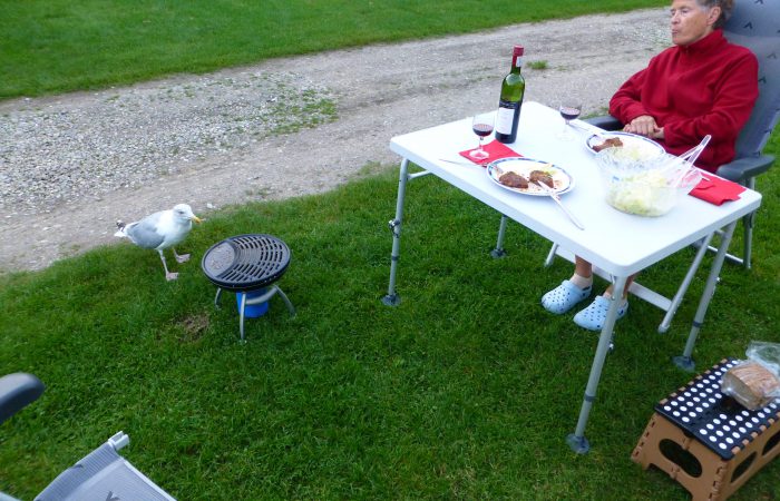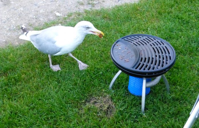 Weniger scheu erlebten wir abends beim Grillieren eine Möwe. Die wollte uns ganz hemmungslos das Fleisch vom Grill klauen. Wir traten